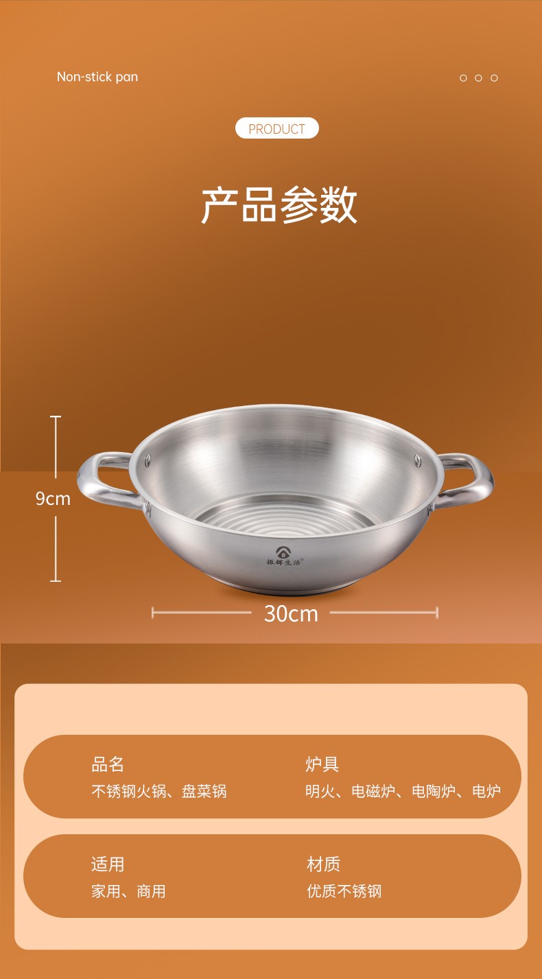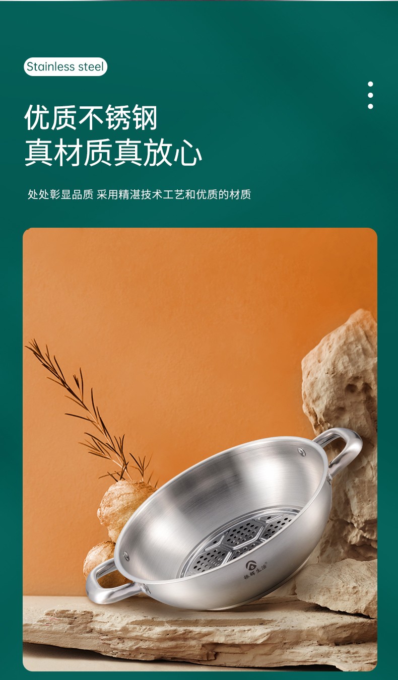 ●可透视不锈钢锅盖,食物情况一清二楚,锅盖提手平面设计,反向平稳放置锅盖,有效避免摇摆摔坏。加大不锈钢锅耳,端锅踏实不拍掉,空心锅耳散热快,有效防烫。